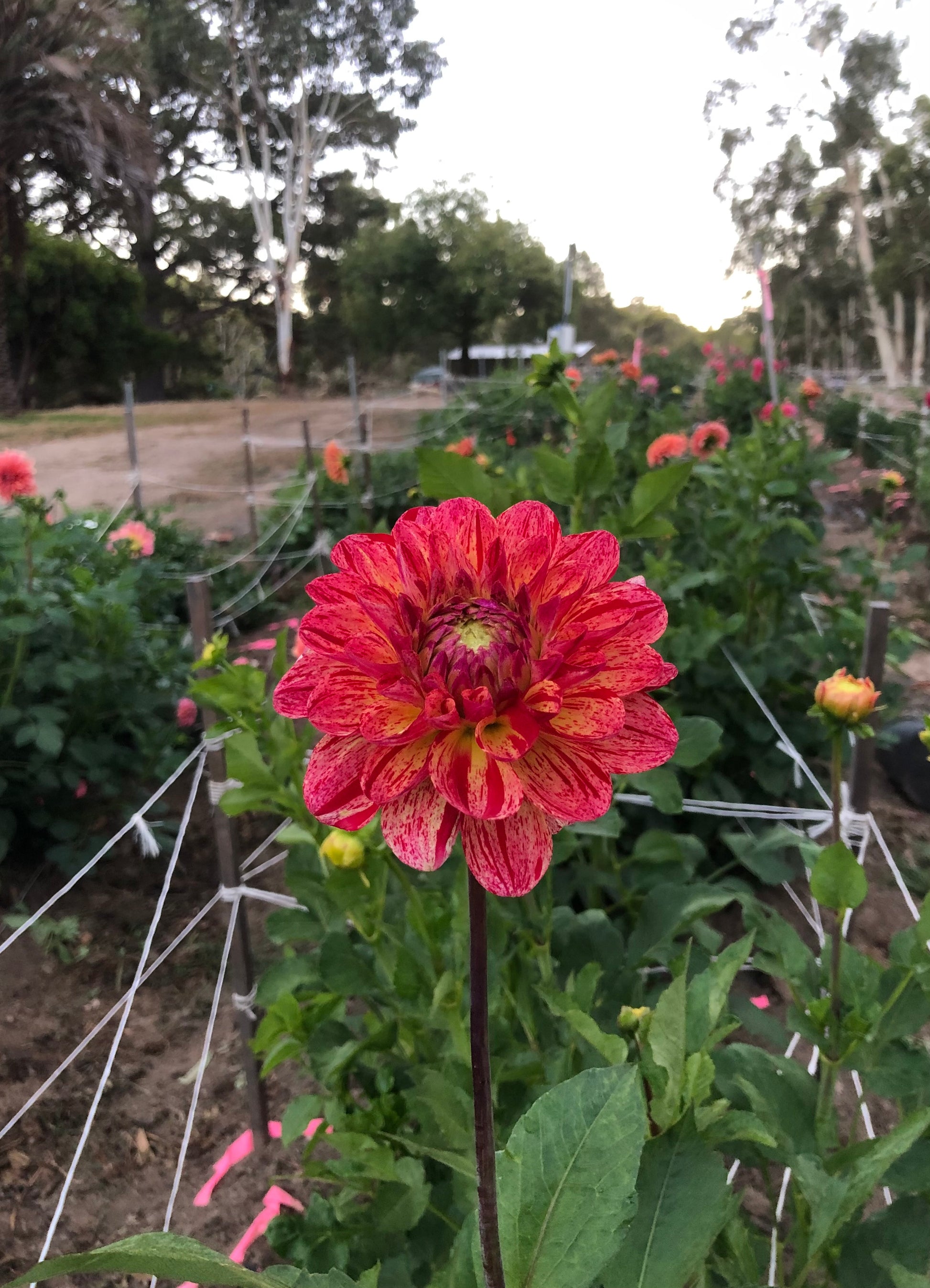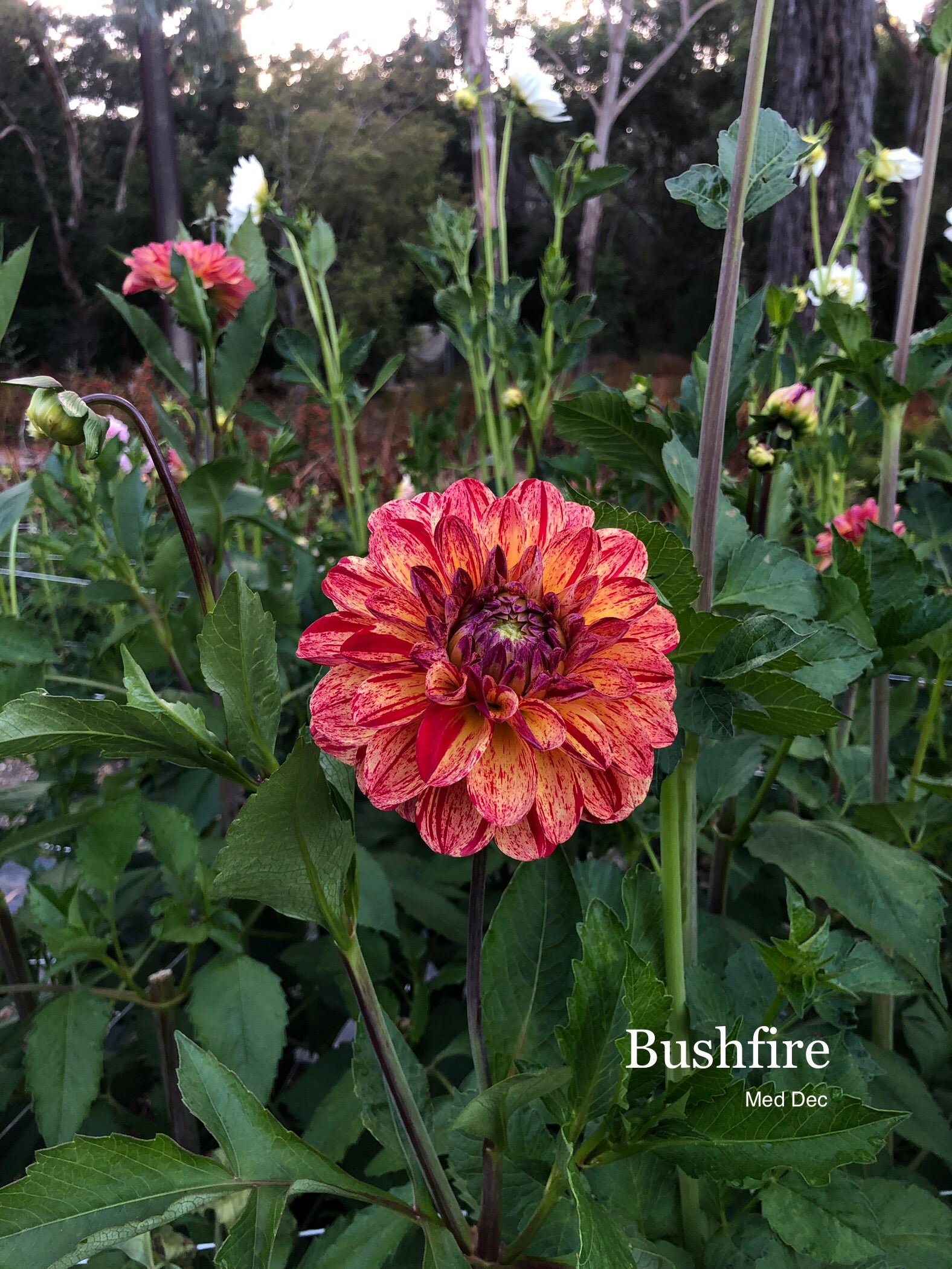 Striking bright red, orange and yellow blooms. Such bright blooms are an eye catcher in the garden or as a cut flower. Medium decorative bloom