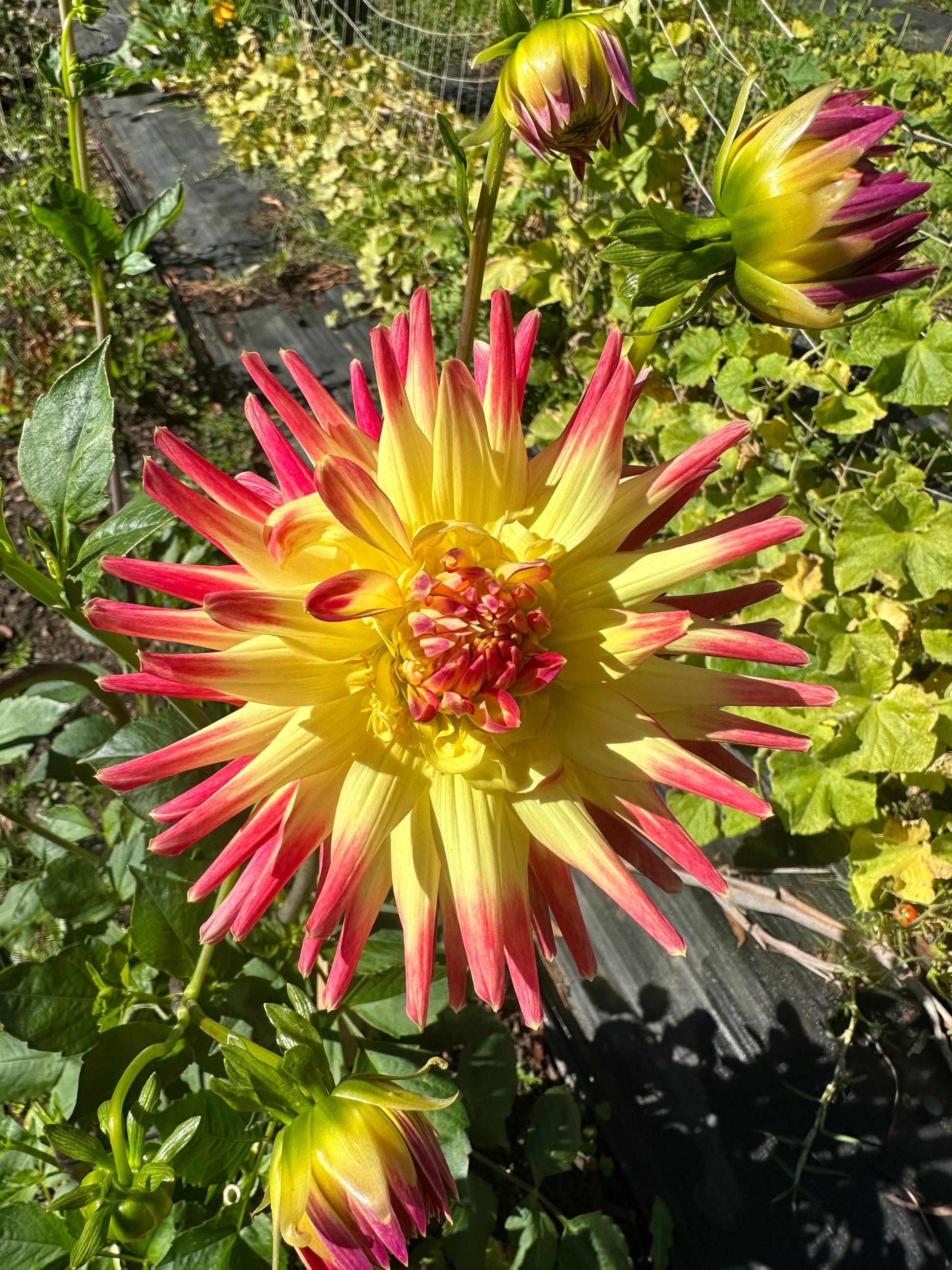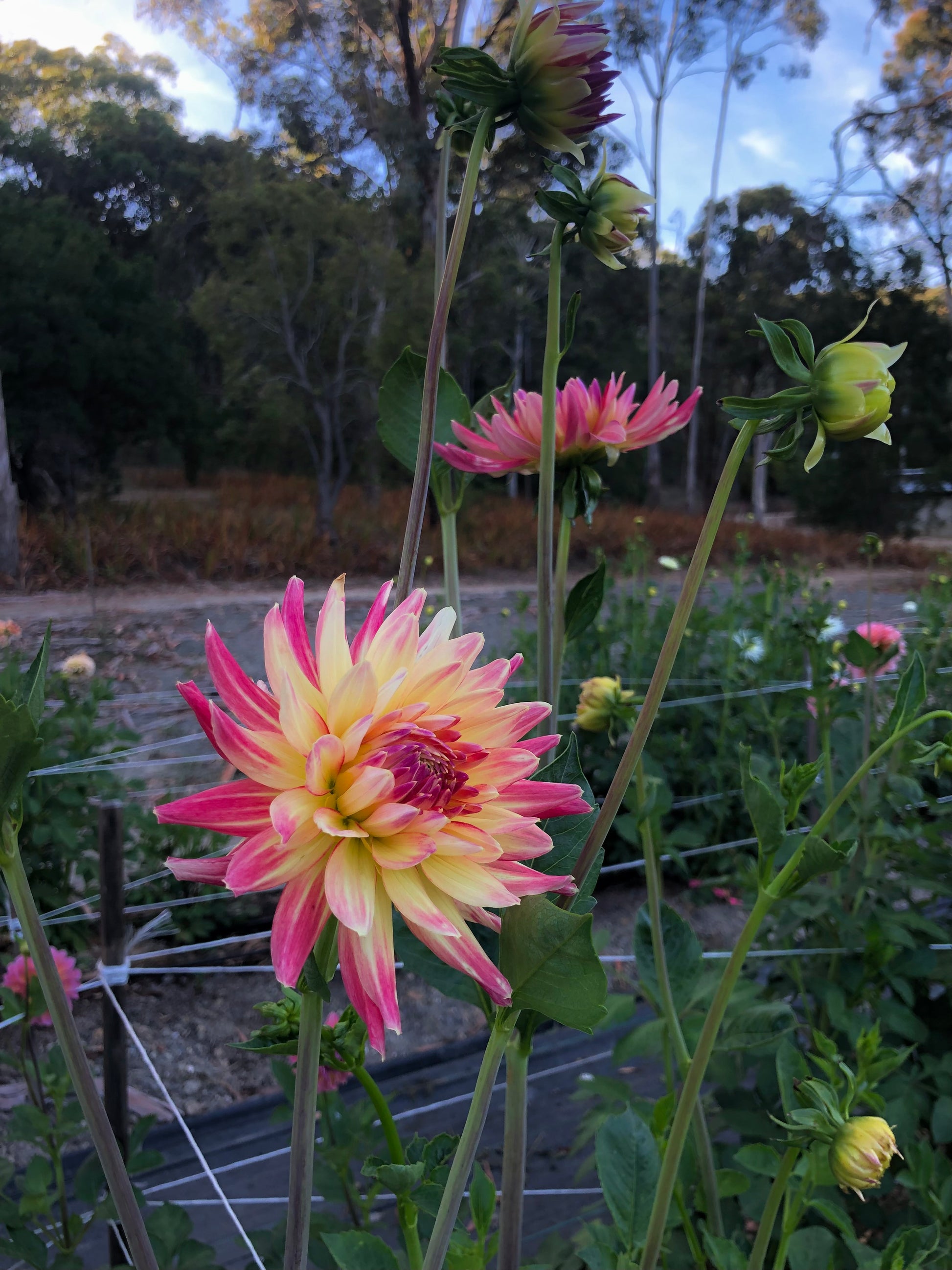 A spectacular bi-colour cactus dahlia. Cactus dahlias add so much structure and definition to floral arrangements. The golden yellow petals blend out to red/pink hues. If you are after masses of blooms, this is the dahlia for you