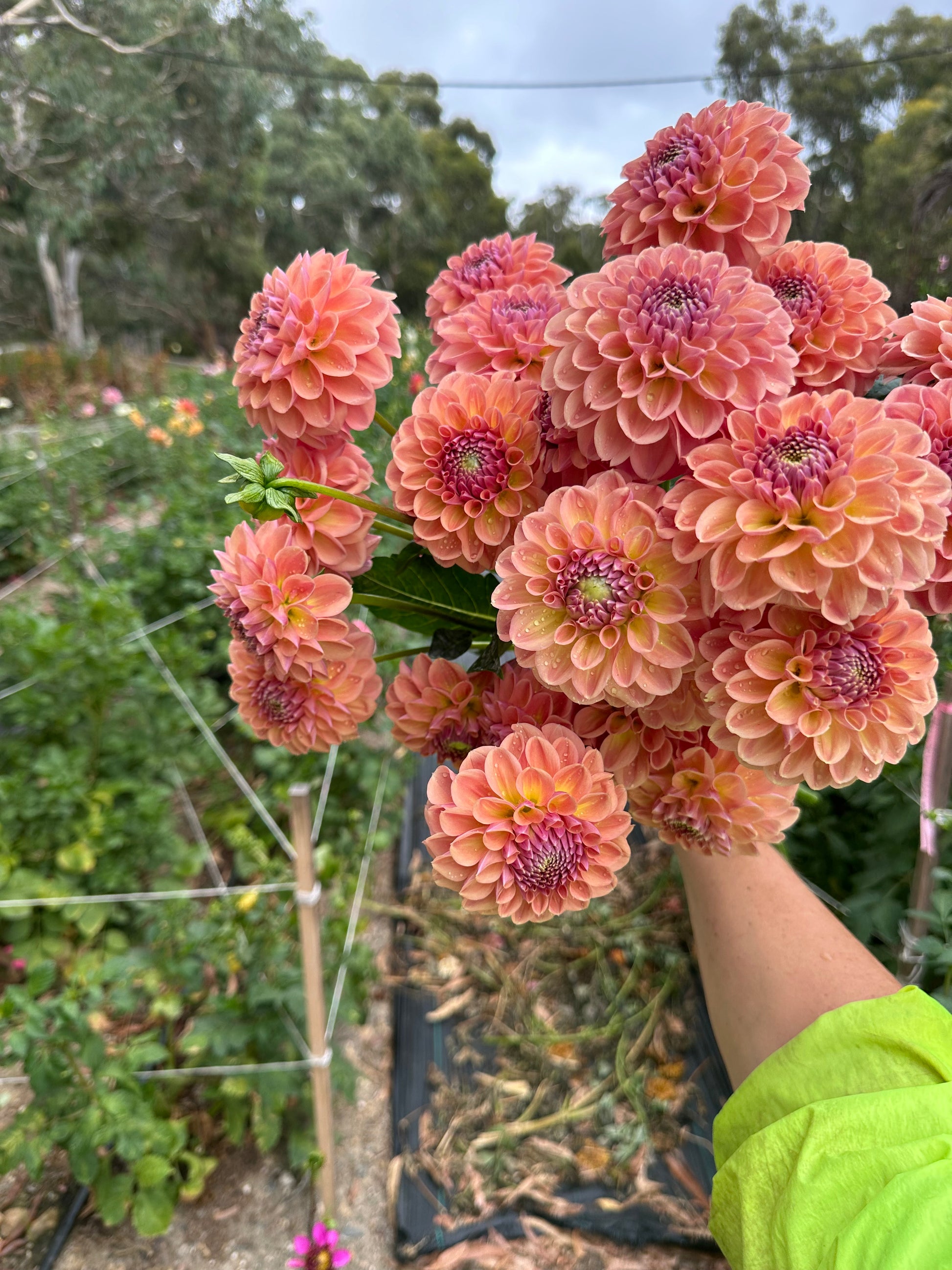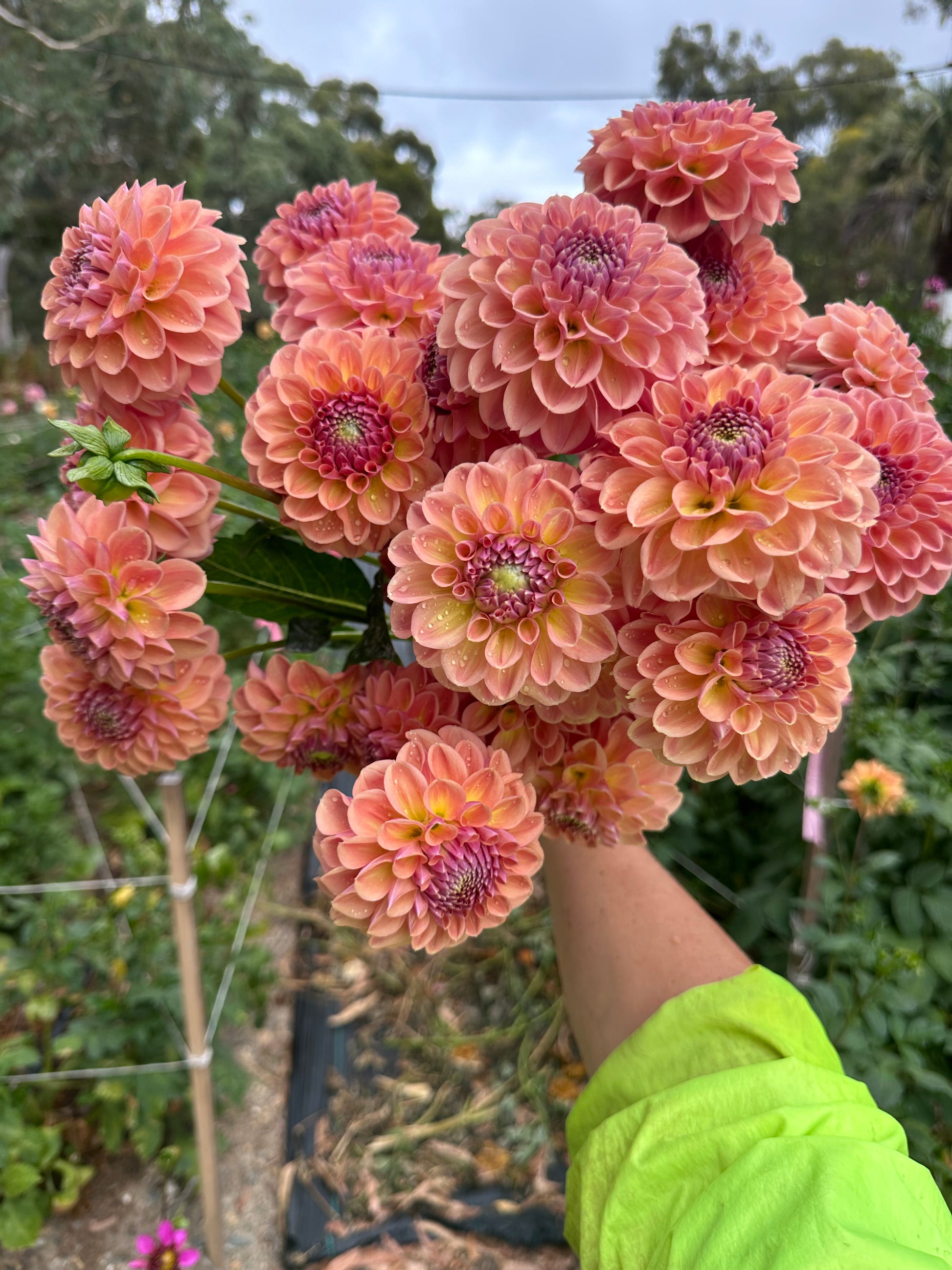 One of our farms absolute show stoppers. We often refer to her as the perfect dahlia. Medium decorative, with soft apricot, peach and copper tones. Long flowering season